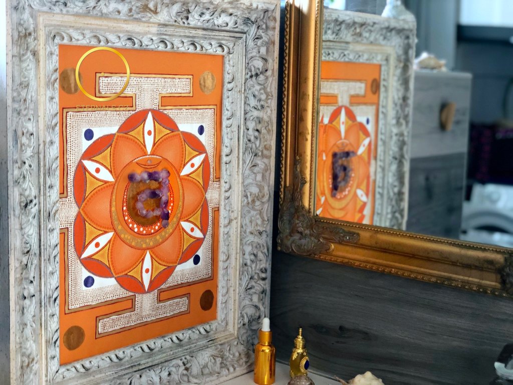 Obraz druhé čakry Svadhištany s názvem DUCHOVNÍ PÁR. Tentokrát jsem její hlavní znak vytvořil s ametystových kamenů, jako symbol produchovnění této čakry, její uzdravení a její plnou kvalitu. Důležitým tématem Svadhištany jsou vztahy, partnerství a tvořivost. Mniši nosí oranžové roucho, má být symbolem vzdání se všech tužeb. A tužby jsou právě to, co vede k negativním vlastnostem.