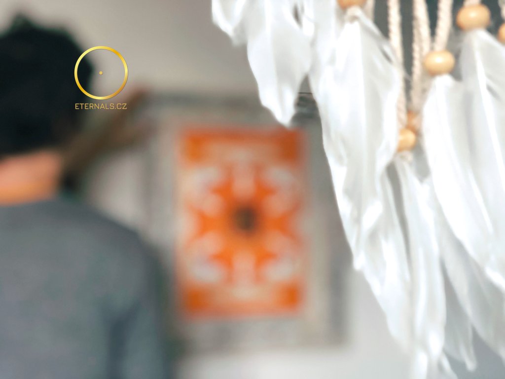 Své blízké máme kolem sebe jako velká naleštěná zrcadla. Až tehdy, když si to uvědomíme, a začneme ze vztahu číst, pak dosáhneme vysokého stupně vědomí, uzdravíme své vztahy, a naše oranžová, druhá čakra bude plně funkční, bude nádherně zářit. Ve druhé čakře sídlí krokodýl, který je nebezpečný. Čeká, kdy podlehneme tužbám, vzteku, hněvu, žárlivosti. Když uzdravíme druhou čakru, produchovníme ji natolik, že jakákoliv akce, skutek, tvrzení, postoj, vztah druhých k nám se nás nedotkne. Do obrazu jsem zakomponoval nádherné duchovní barvy, které oranžovou podpoří a obohatí, je to bílá, zlatá, fialová.