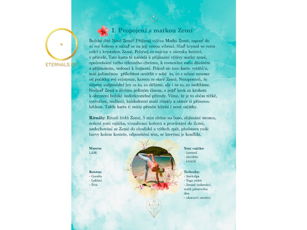 Nové paradigma Nové Země přináší 12 témat pro ženský aspekt každého člověka. Pojďte se nechat unášet, vytáhněte si jednu kartu, která vám přinese vaše téma Nové Země a inspiruje vás technikou a nástroji pro naladění se na nové vibrace. Ke kartám existují i dva online kurzy, ke kterým tyto karty mohou být doplňkem, každá karta představuje jednu sestavu z online kurzu BOHOJÓGA dvacetimminutovky, ale také BOHOMEDITACE20.